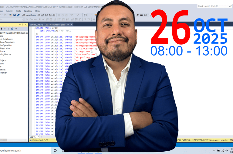 Es un evento gratuito y en vivo de DataMaster School, donde durante 5 horas intensivas aprenderás los fundamentos de SQL Server, desde la creación de bases de datos hasta consultas avanzadas y automatización con Stored Procedures y Triggers.